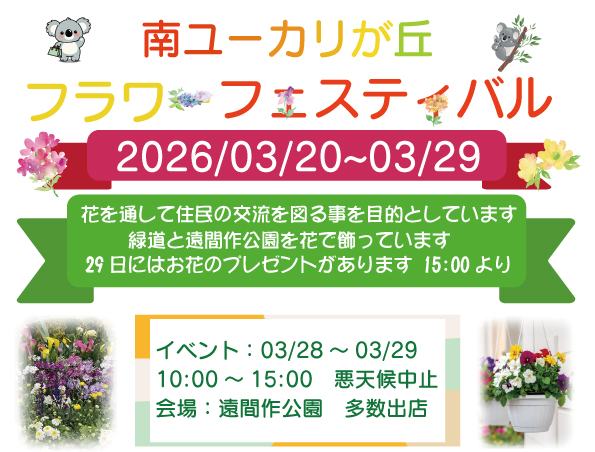 2026/03/20~03/29に南ユーカリが丘の緑道と遠間作公園をたくさんのお花で彩ります。